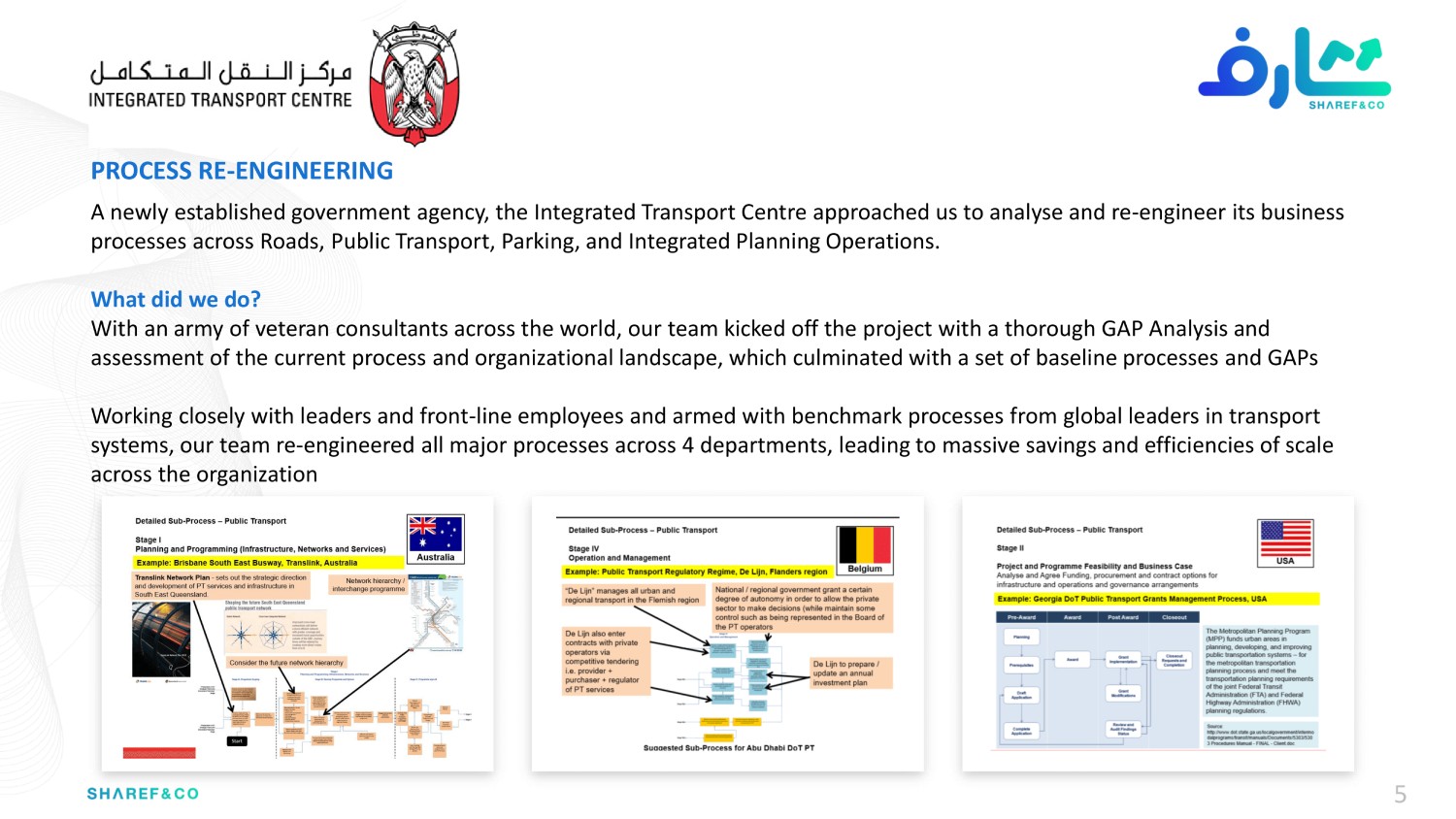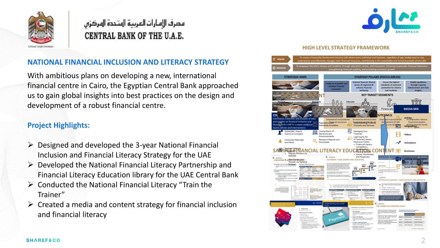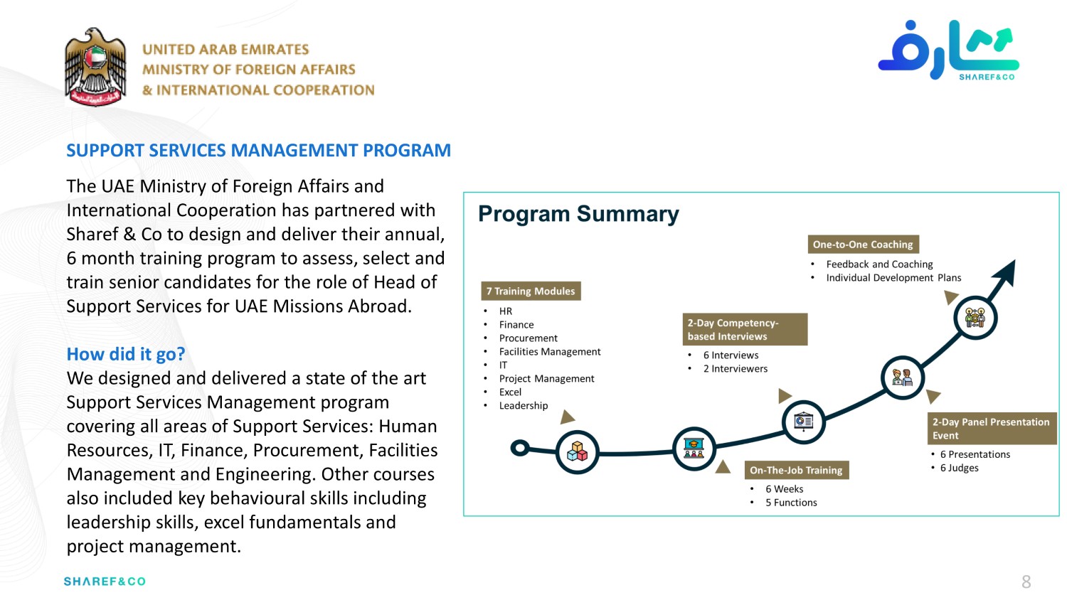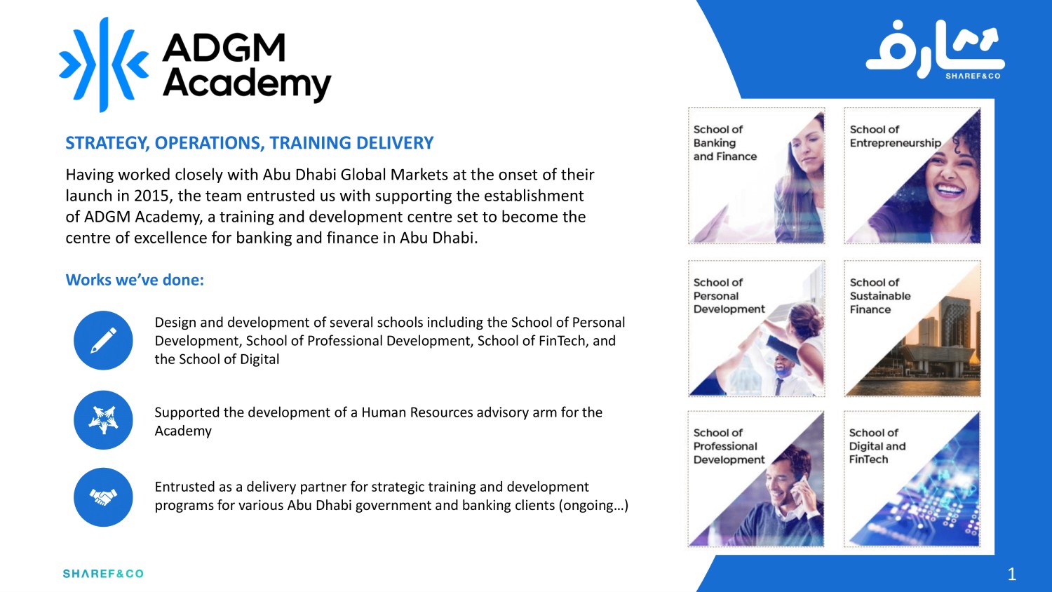 Drawing on over 40+ years of combined experience and diverse skills sets from a global team of experts, Sharef & Co. has been trusted by over 80 global clients to deliver everything from strategy and operating models, branding and marketing campaigns; to process re-engineering, organizational development and corporate training programs.