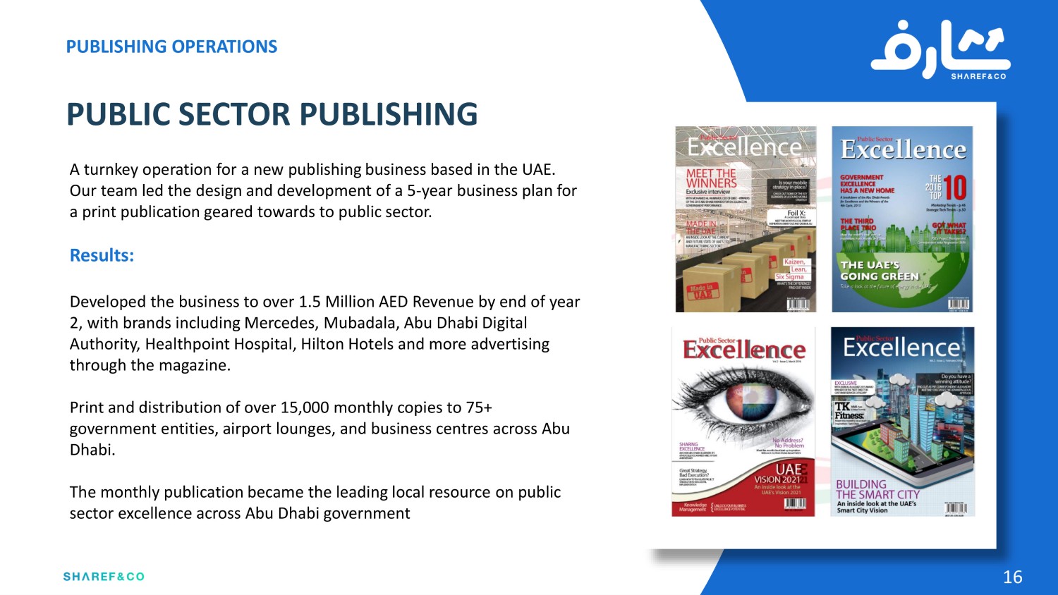 With offices in London, Toronto, Abu Dhabi and Muscat, Sharef & Co. is a family of companies that span Management Consulting, Media, Publishing, and Corporate Training domains with a flawless track record of delivering successful client results.